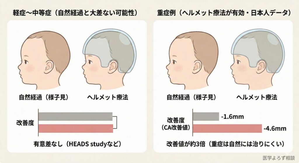 CNSガイドラインは、この研究を踏まえた上で、なお「重症例では早期ヘルメット治療がより有意な改善をもたらす」と結論づけています [1]。日本の研究でも、重症斜頭症に対するヘルメット療法の有効性は確認されています [9]。