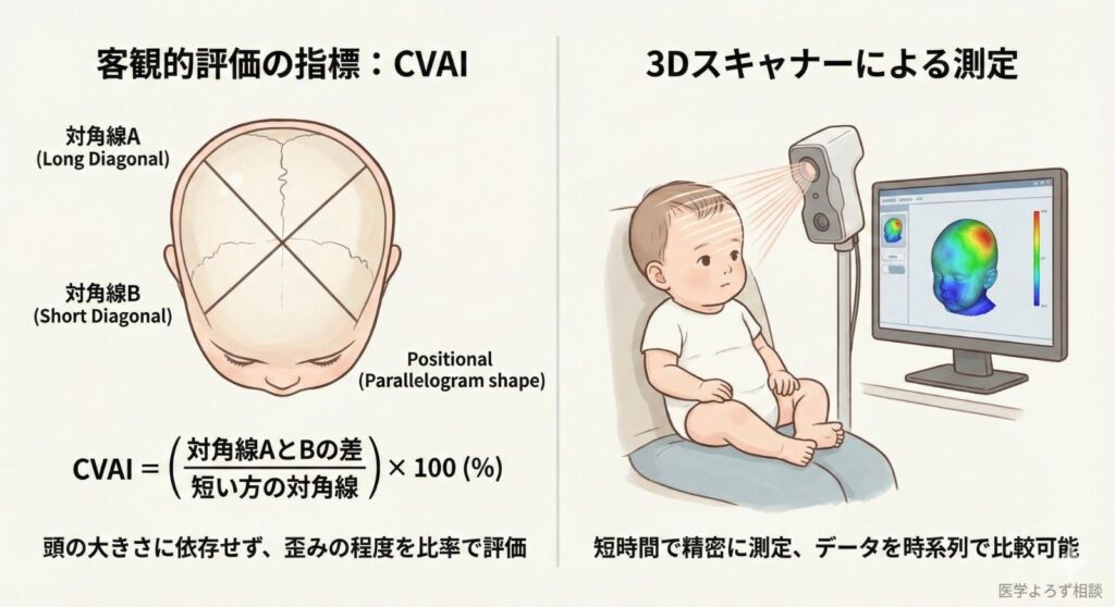 CVAIは「頭蓋非対称性指数」と呼ばれ、対角線の長さの差を比率で表したものです。この指標の利点は、頭の大きさに依存せず比較できる点にあります。