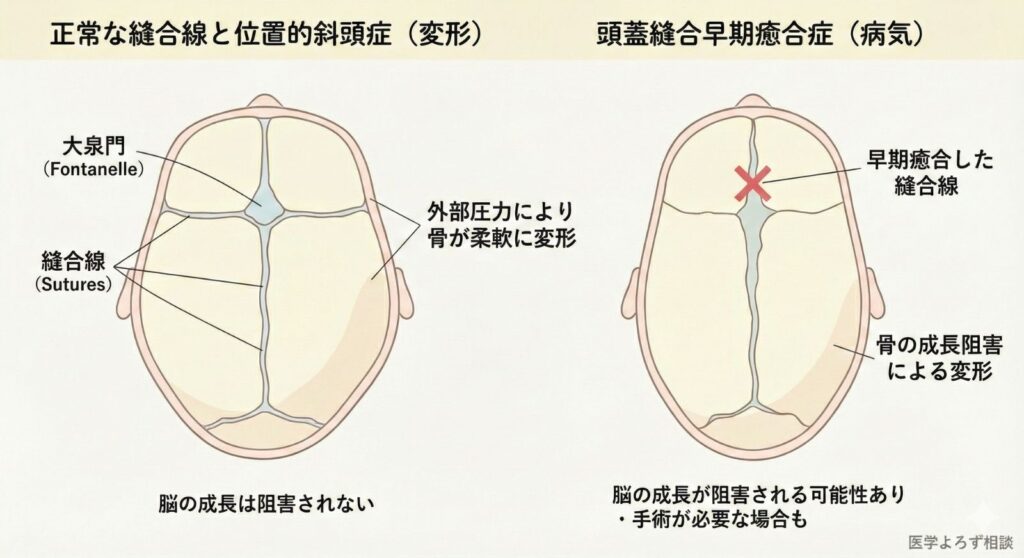 赤ちゃんの頭の形の異常には、大きく分けて2つの原因があります。一つは頭蓋縫合早期癒合症(craniosynostosis)という病気で、頭蓋骨をつなぐ「縫合線」が生まれつき早く閉じてしまい、脳の成長に伴って頭が異常な形に変形するもの。もう一つが、この記事で扱う位置的斜頭症(positional plagiocephaly)で、外部からの圧力——つまり向き癖や寝かせ方——によって柔らかい頭蓋骨が変形するものです [1]。