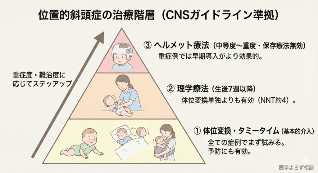 - 治療選択の根拠: 軽症は経過観察、生後7週からは理学療法(NNT約4)、重症で保存療法無効ならヘルメット療法